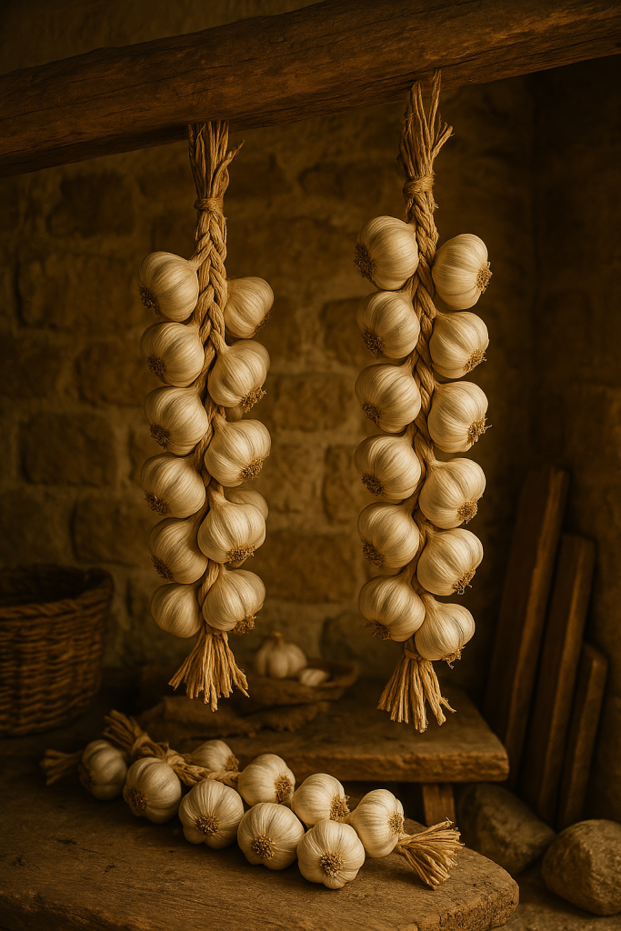 Yüksek tavan, loş ışık, temiz hava… Örgü sarımsaklar bu koşullarda 6-9 ay tazeliğini korur. Aynı zamanda dekoratif!